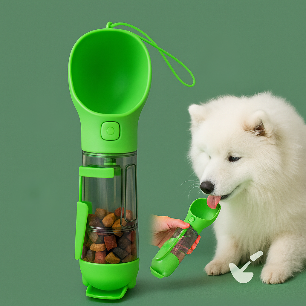 PupiBidon to lekka i kompaktowa butelka 4w1: woda, karma, woreczki i łopatka – wszystko pod ręką.